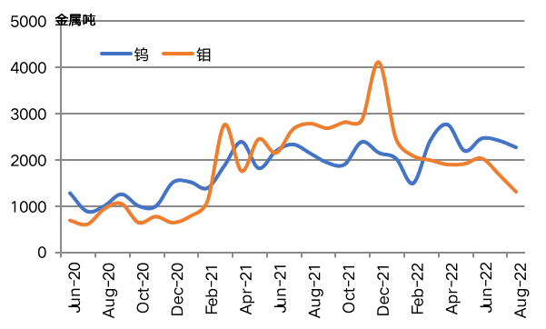图3 中国钨钼产业合成指数曲线 三、2022年9月份行业运行特点 (一)钨钼产量环比均小幅下降 受环保核查、部分矿山停产检修影响,9月份国内钨钼产量环比均小幅下降。据相关统计,9月我国钨精矿(65%氧化钨)产量约6231吨,环比下降5.3%;三季度钨精矿产量1.95万吨;9月钼精矿产量8942吨钼(金属量),环比下降4.2%;三季度钼精矿产量2.69万吨钼,环比下降1.5%。 (二)8月钨钼出口环比均继续下降 欧洲能源危机导致制造业放缓,海外钨钼需求下降,9月我国钨钼产品出口环比继续下降。据海关统计,8月我国出口钨品2270吨(金属量,下同),环比下降6.1%,同比增长6%。其中,钨冶炼产品出口1063吨,环比下降12%,同比增长21.3%;钨粉末产品出口978吨,环比增长0.7%,同比下降6.5%;钨金属制品出口229吨,环比下降4.3%,同比增长4.2%。同期,我国出口钼品1314吨钼(金属量,下同),环比下降22.3%,同比下降52.9%。其中,钼炉料产品出口841吨钼,环比下降25.1%,同比下降62.7%;钼化工产品出口234吨钼,环比增长33.0%,同比增长28.6%;钼金属制品出口239吨钼,环比下降39.0%,同比下降31.7%。