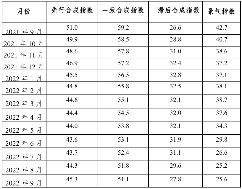图2 中国钨钼产业景气信号灯 二、先行合成指数继续上升 2022年9月份,在钨钼行业景气指数中,先行合成指数为45.3,较上月上升1.0点。在先行合成指数的6个具体指标中,M2、钨钼固定资产指数和硬质合金指数较上月分别上升了1.0%、7.5%和0.4%;钨钼价格指数、钨钼出口额指数和粗钢指数较上月分别下降了2.1%、2.5%和1.4%。中国钨钼产业合成指数趋势见图3。